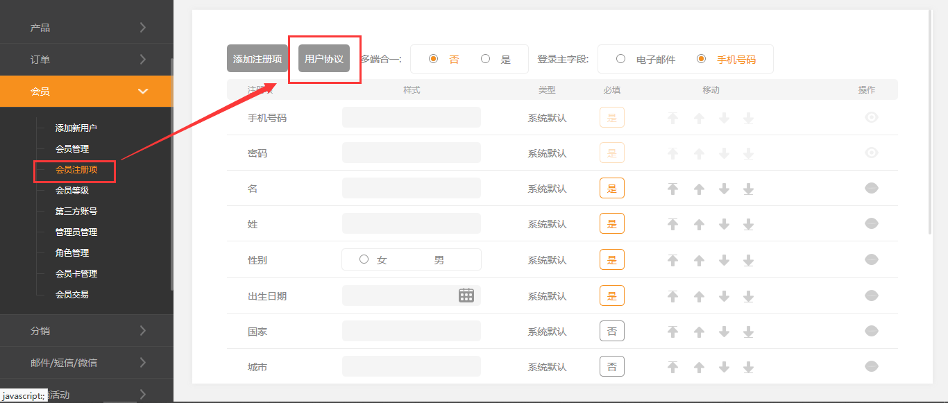 1,在后台管理-会员-会员注册项-用户协议中,开启协议。
